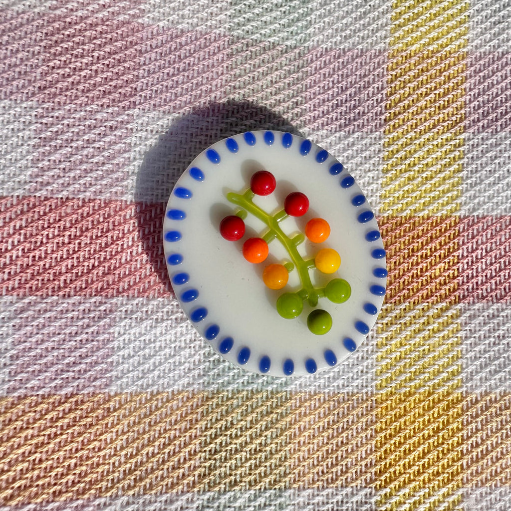 Made with fused opalescent Bullseye glass and attached to a .5” magnet, perfect for showcasing your itty bitty cutie on a fridge (or any magnetic surface).