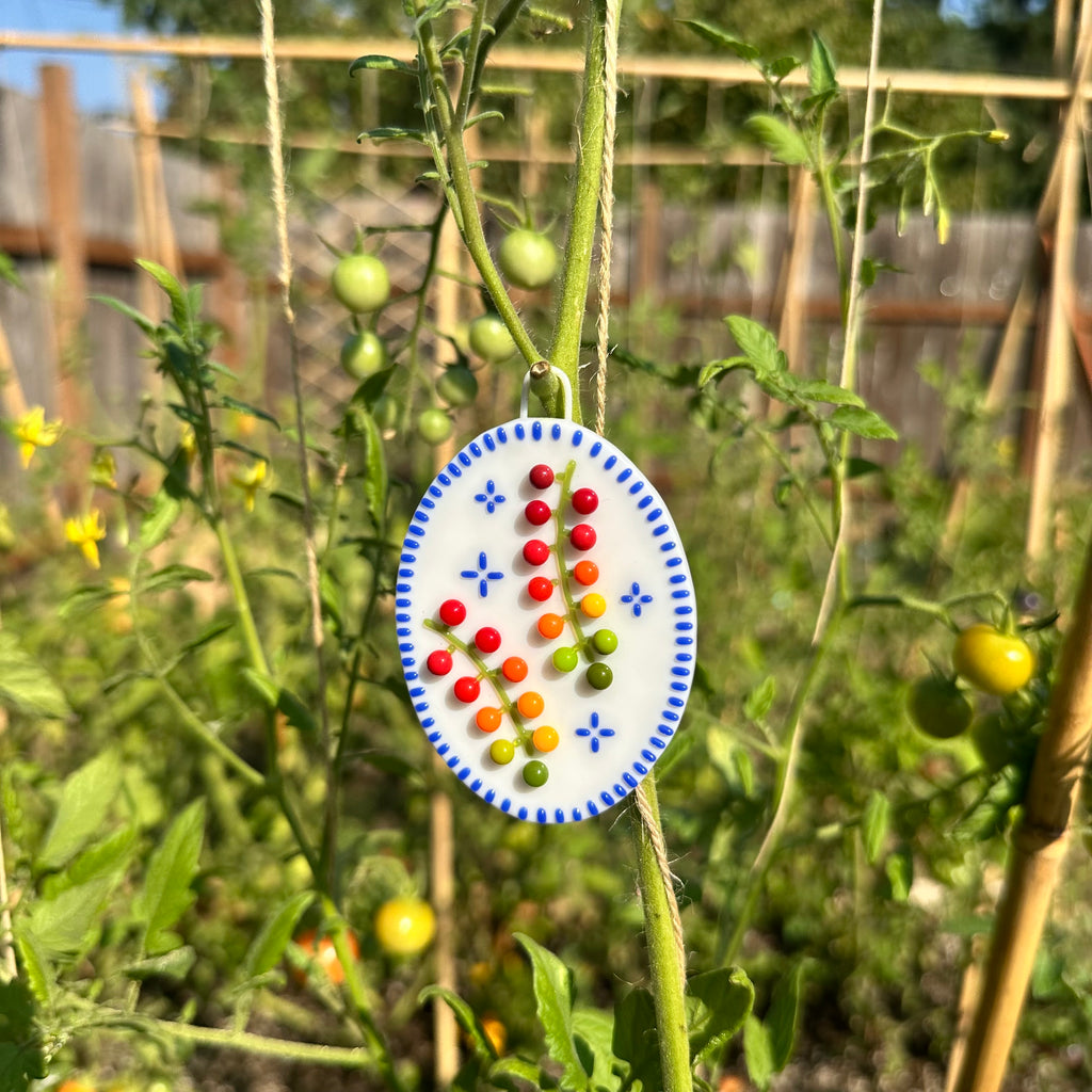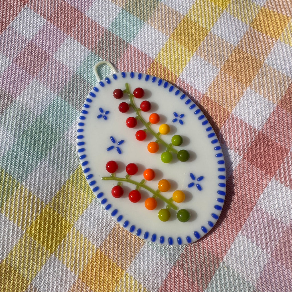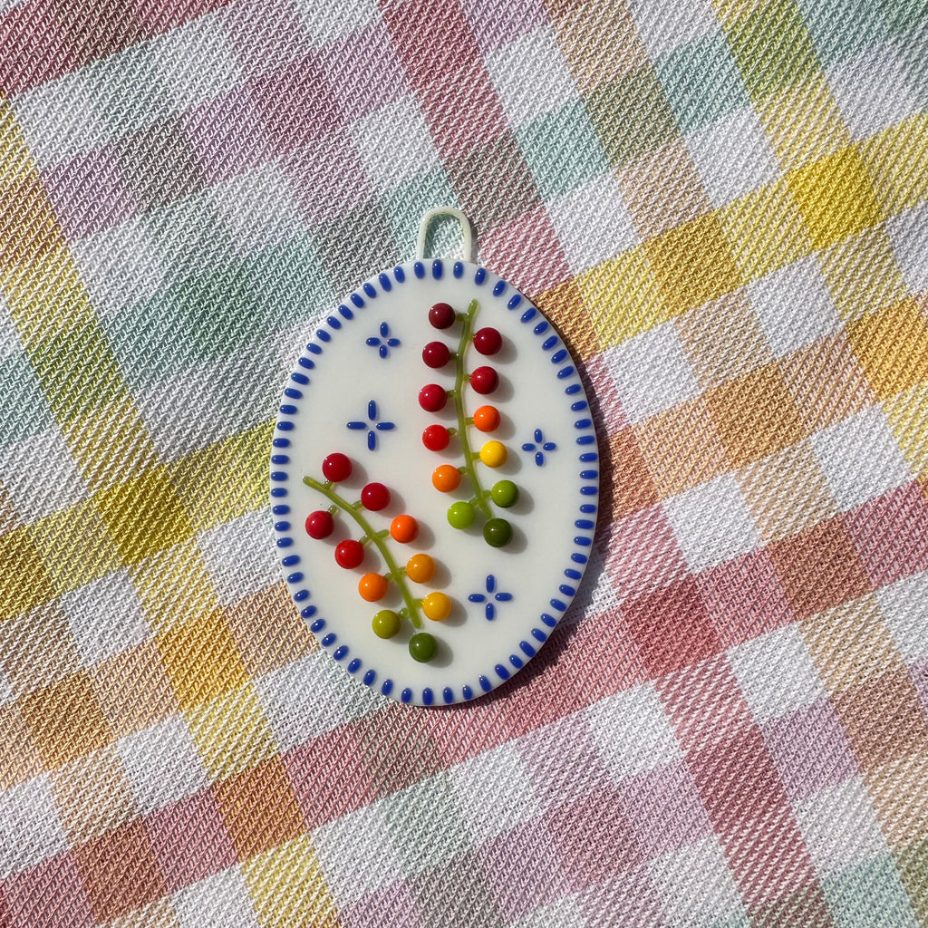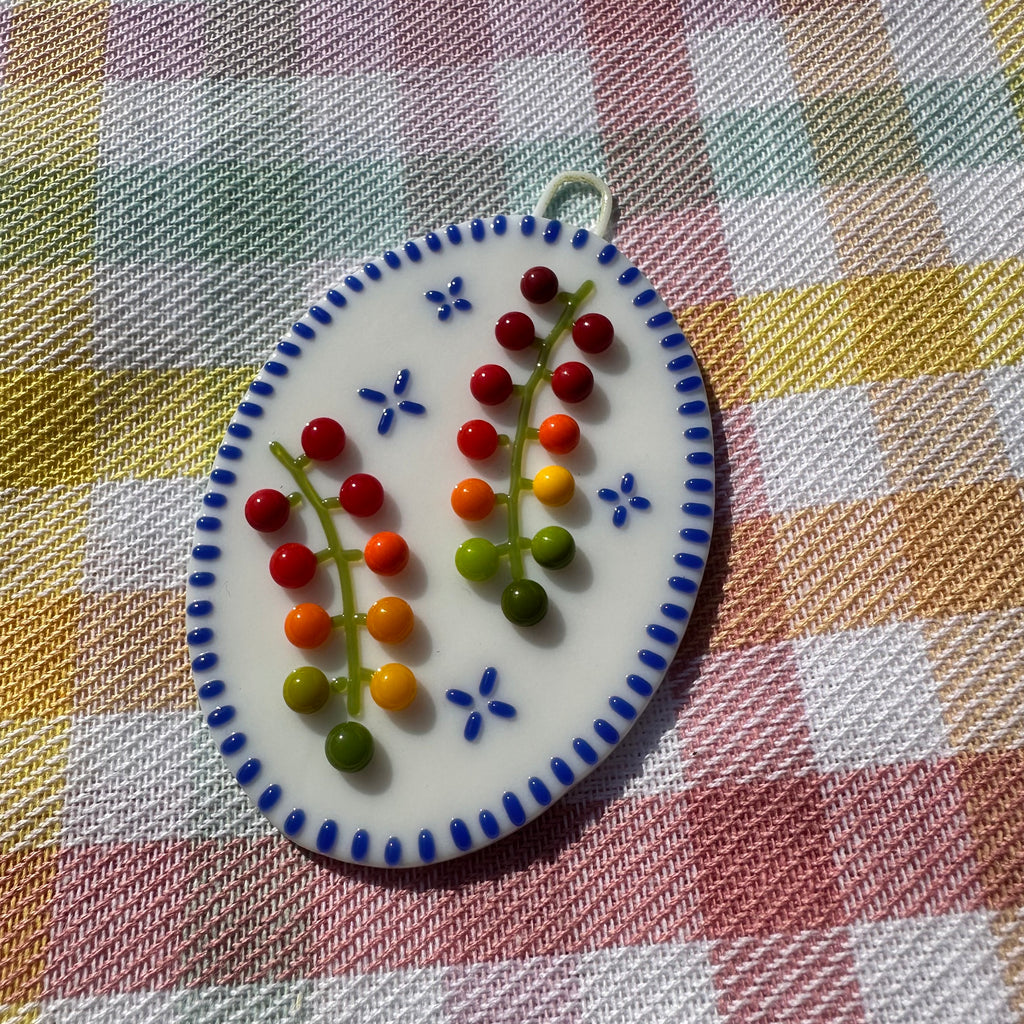 Made with fused opalescent Bullseye glass. Plaque was made with a hanging loop incorporated into the design, perfect for showcasing your cherry tomatoes vine cutie plaque on any wall.